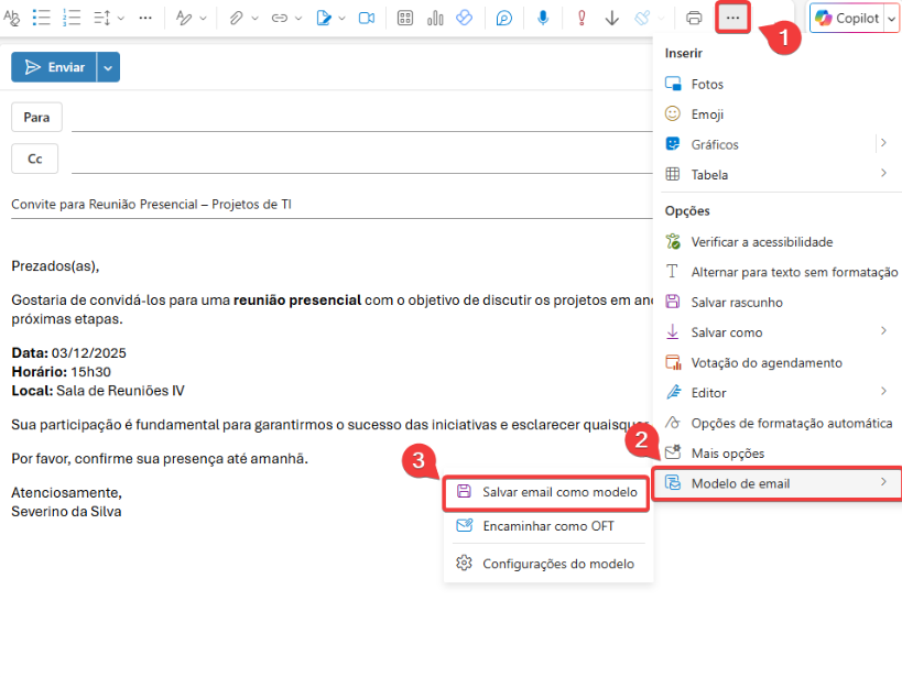 3. Com a mensagem aberta, clique na nos 3 pontinhos (canto superior direito) e selecione Modelo de email > Salvar email;