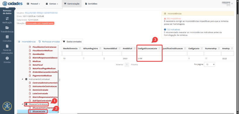 Como o nome da categoria sugere, essas impeditivas são relacionadas aos campos de situação de lotes ou de instrumentos de contratação, ocorrendo em situações como quando a remessa atual é enviada com dados incompatíveis com a remessa anterior, ou quando os campos estão preenchidos em desacordo com as determinações do Anexo VI da Instrução Normativa 68/2020.