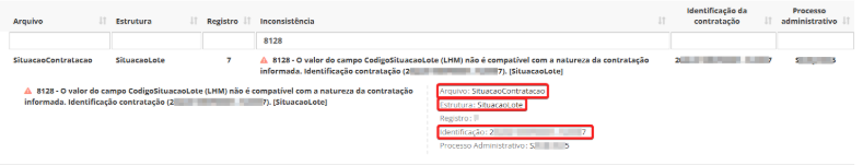 1.  Verifique, na impeditiva, a Identificação da contratação (ID), o arquivo e a estrutura;