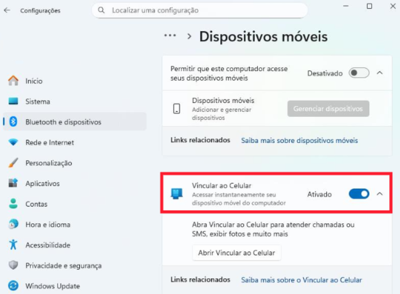 3. No computador, acesse: Configurações > Bluetooth e dispositivos > Dispositivos móveis > ative a opção Vincular ao Celular;