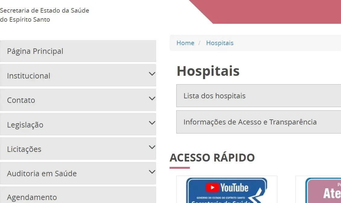 A Sesa, por sua vez, deverá manter o endereço eletrônico institucional (https://saude.es.gov.br) que contará com a aba ‘hospitais’. Esta aba que irá reunir, de forma sistematizada e centralizada, as informações de transparência ativa relativas a todos os hospitais sob gestão estadual – sejam geridos diretamente pela Sesa, por fundações públicas ou por meio de contratos de gestão firmados com Organizações Sociais.